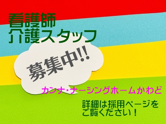 - 介護スタッフ 急募!!現在、カンナ・ナーシングホームかわどでは介護スタッフを募集しています。
