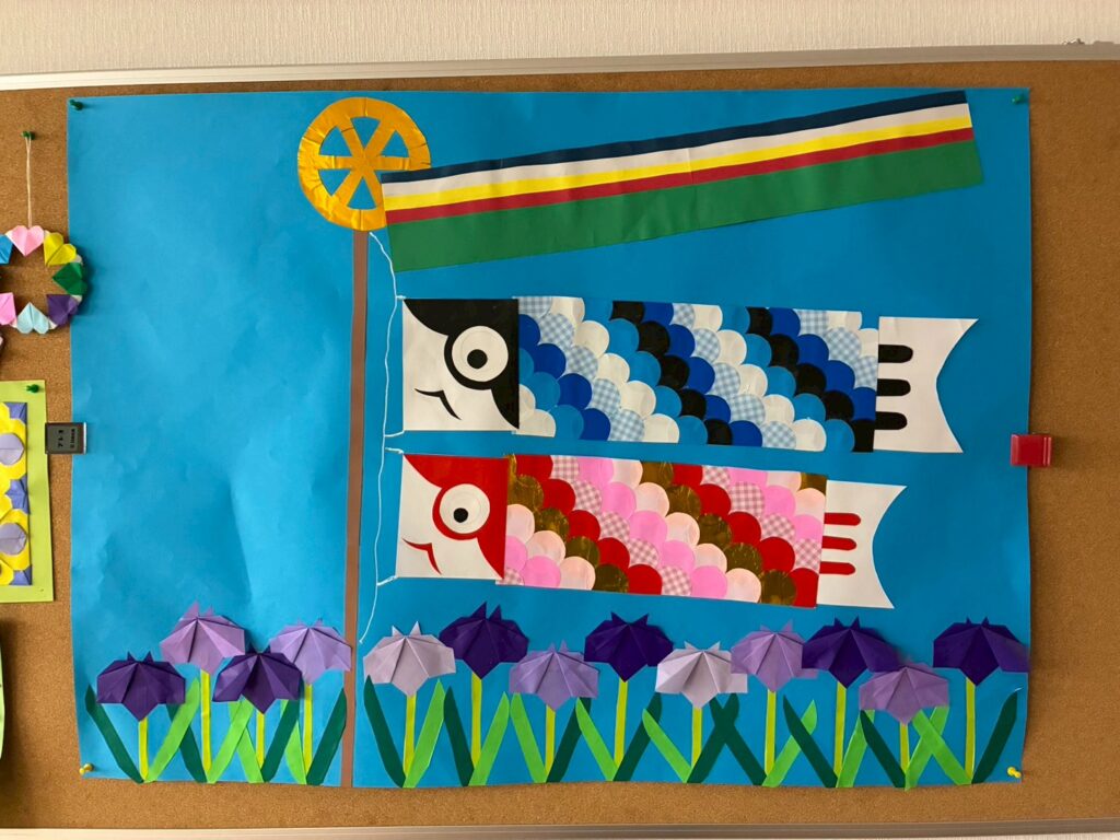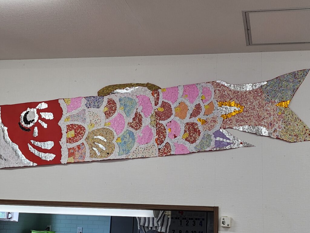 通所のみなさんで作ったこいのぼりもできあがったので、室内に飾っています。